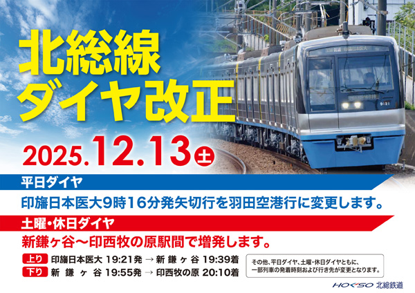 時刻表 乗換検索 運賃検索 時刻表 乗換検索 運賃検索 路線図 ご利用案内 小さなお子様 とのご利用 駅情報 ※駅名をクリックすると各駅の詳細情報へリンクします。 京成高砂 新柴又 矢切 北国分 秋山 東松戸 松飛台 大町 新鎌ヶ谷 西白井 白井 小室 千葉ニュータウン中央 印西牧の原 印旛日本医大 トピックス カテゴリ別にみる すべて お知らせ ニュースリリース 一覧 2025.12.15 お知らせ 冬のお出かけきっぷ「北総線1日乗車券」を発売します! 2025.12.15 お知らせ 「北総線沿線活性化トレイン」の運行予定(12/15~12/28) 2025.12.11 ニュースリリース 北総線で乾杯!「新春ほくそうビール列車」イベント開催 2025.12.11 お知らせ 白井駅エレベーター更新工事に伴う停止のお知らせ(2026年1月14日(水)~2月19日(木)) 2025.12.11 お知らせ 「北総線沿線活性化トレイン」の運行予定(12/13~12/21) 2025.12.15 お知らせ 冬のお出かけきっぷ「北総線1日乗車券」を発売します! 2025.12.15 お知らせ 「北総線沿線活性化トレイン」の運行予定(12/15~12/28) 2025.12.11 お知らせ 白井駅エレベーター更新工事に伴う停止のお知らせ(2026年1月14日(水)~2月19日(木)) 2025.12.11 お知らせ 「北総線沿線活性化トレイン」の運行予定(12/13~12/21) 2025.12.05 お知らせ 「盲導犬ユーザー等対応講習会」を開催しました 2025.12.11 ニュースリリース 北総線で乾杯!「新春ほくそうビール列車」イベント開催 2025.11.27 ニュースリリース 鉄道事業者共同でPR「暴力行為防止ポスター『 酔っ払ってもSTOP!暴力 』」 12月1日(月)から各事業者の駅構内、列車内に掲出します! 2025.11.21 ニュースリリース 決算情報「2025年度中間決算について」を掲載しました 2025.11.12 ニュースリリース チェックインラリーのプラットフォームサービス『みんラリ』上にて「北総線デジタルスタンプラリー」を初開催! 2025.11.12 ニュースリリース 北総線ダイヤ改正を実施します 一覧 沿線情報 詳しく見る 詳しく見る 詳しく見る 詳しく見る 北総線沿線地域活性化協議会 北総線及び沿線地域の活性化を図ることを目的に、まちづくりや地域の賑わいの創出などの事業を鉄道事業者と沿線地域が連携して実施するための組織です。 詳しく見る