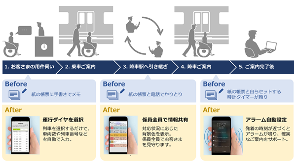 本サービスは、口頭伝達などのやり取りを主とする列車乗降サポート業務のプロセスを電子化し、利用受付から駅係員間の連絡・引継ぎ、乗降サポートの実績管理といった一連の連絡業務をスマートデバイス上で完結できるものです。スマートデバイスにより乗降駅間での情報をリアルタイムに共有することで、「駅係員の対応効率化、負担軽減」を実現し、よりスムーズなご案内が可能となります。