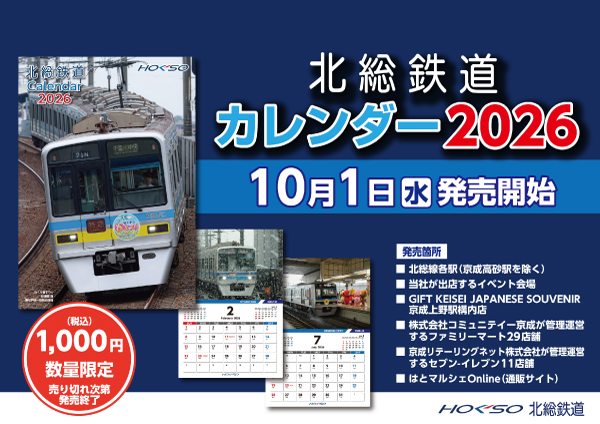 時刻表 乗換検索 運賃検索 時刻表 乗換検索 運賃検索 路線図 ご利用案内 小さなお子様 とのご利用 駅情報 ※駅名をクリックすると各駅の詳細情報へリンクします。 京成高砂 新柴又 矢切 北国分 秋山 東松戸 松飛台 大町 新鎌ヶ谷 西白井 白井 小室 千葉ニュータウン中央 印西牧の原 印旛日本医大 トピックス カテゴリ別にみる すべて お知らせ ニュースリリース 一覧 2025.10.28 お知らせ 11月のエレベーター定期点検予定日について 2025.10.27 お知らせ 「北総線沿線活性化トレイン」の運行予定(10/27~11/9) 2025.10.21 お知らせ 「やめましょう、歩きスマホ。」キャンペーンを11月1日(土)から実施します。 2025.10.15 ニュースリリース 「ほくそう車両基地まつり」を開催します! 2025.10.15 ニュースリリース 移動制約者ご案内業務支援サービスを導入・運用開始します! 2025.10.28 お知らせ 11月のエレベーター定期点検予定日について 2025.10.27 お知らせ 「北総線沿線活性化トレイン」の運行予定(10/27~11/9) 2025.10.21 お知らせ 「やめましょう、歩きスマホ。」キャンペーンを11月1日(土)から実施します。 2025.10.10 お知らせ 「乗務員に向けた護身講習」を実施しました 2025.10.02 お知らせ 1日乗車券に関するアンケートのお願い 2025.10.15 ニュースリリース 「ほくそう車両基地まつり」を開催します! 2025.10.15 ニュースリリース 移動制約者ご案内業務支援サービスを導入・運用開始します! 2025.10.10 ニュースリリース 「第9回京成グループウォーク」を開催します! 2025.10.10 ニュースリリース 「第54回北総ウォーク」を期間設定型で開催します! 2025.09.26 ニュースリリース 京成電鉄・北総鉄道合同による 「スカイライナー異常時合同訓練」を実施しました 一覧 沿線情報 詳しく見る 詳しく見る 詳しく見る 詳しく見る 北総線沿線地域活性化協議会 北総線及び沿線地域の活性化を図ることを目的に、まちづくりや地域の賑わいの創出などの事業を鉄道事業者と沿線地域が連携して実施するための組織です。 詳しく見る