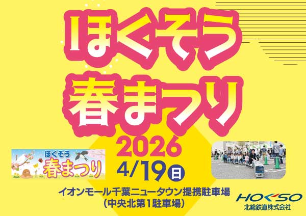 時刻表 乗換検索 運賃検索 時刻表 乗換検索 運賃検索 路線図 ご利用案内 小さなお子様 とのご利用 駅情報 ※駅名をクリックすると各駅の詳細情報へリンクします。 京成高砂 新柴又 矢切 北国分 秋山 東松戸 松飛台 大町 新鎌ヶ谷 西白井 白井 小室 千葉ニュータウン中央 印西牧の原 印旛日本医大 トピックス カテゴリ別にみる すべて お知らせ ニュースリリース 一覧 2026.04.08 イベント情報 「ほくそう春まつり2026」 ステージプログラム 2026.04.06 お知らせ 「ウマ娘コラボ広告ジャックトレイン」の運行予定(4/6~4/19) 2026.04.01 ニュースリリース 「プラレール 北総鉄道9100形(C-Flyer)」を新発売! 2026.04.01 イベント情報 北総鉄道で開催するイベント予定(2026年4月~2026年9月) 2026.03.31 催事販売情報 4月 催事販売情報を掲載しました 2026.04.08 イベント情報 「ほくそう春まつり2026」 ステージプログラム 2026.04.06 お知らせ 「ウマ娘コラボ広告ジャックトレイン」の運行予定(4/6~4/19) 2026.04.01 イベント情報 北総鉄道で開催するイベント予定(2026年4月~2026年9月) 2026.03.31 催事販売情報 4月 催事販売情報を掲載しました 2026.03.31 お知らせ 「かけこみ乗車防止キャンペーン」を実施します 2026.04.01 ニュースリリース 「プラレール 北総鉄道9100形(C-Flyer)」を新発売! 2026.03.27 ニュースリリース 松戸市立松戸高等学校×北総鉄道 東松戸駅にて高校生通訳ボランティアを実施しました! 2026.03.25 ニュースリリース 「ほくそう春まつり2026」を開催!県内外から鉄道会社が多数集結&臨時特急列車「ほくそう春まつり号」運転! 2026.03.25 ニュースリリース 「Solaseed Air&Hokuso-railway wings キャンペーン」を開催 2026.03.25 ニュースリリース 「北総線都心直通35周年記念乗車券」を発売! 一覧 沿線情報 詳しく見る 詳しく見る 詳しく見る 詳しく見る 北総線沿線地域活性化協議会 北総線及び沿線地域の活性化を図ることを目的に、まちづくりや地域の賑わいの創出などの事業を鉄道事業者と沿線地域が連携して実施するための組織です。 詳しく見る