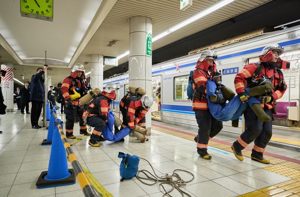 ④駅係員の空気呼吸器装着(地下駅での火災対応)